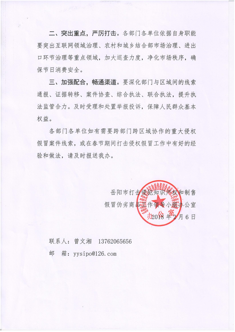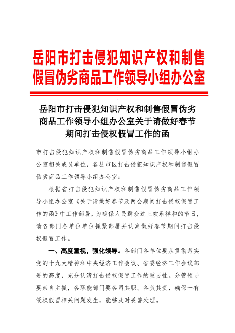 岳阳市打击侵犯知识产权和制售假冒伪劣商品工作领导小组办公室关于请做好春节期间打击侵权假冒工作的函