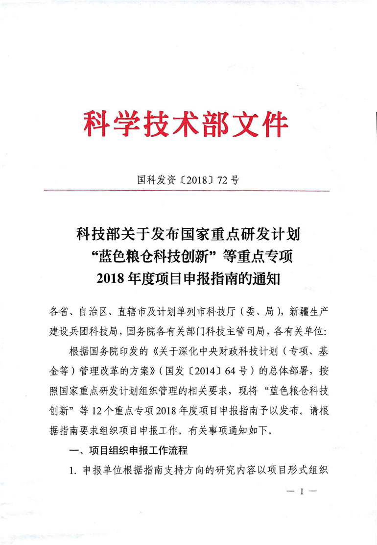 科技部关于发布国家重点研发计划“蓝色粮仓科技创新”等重点专项2018年度项目申报指南的通知