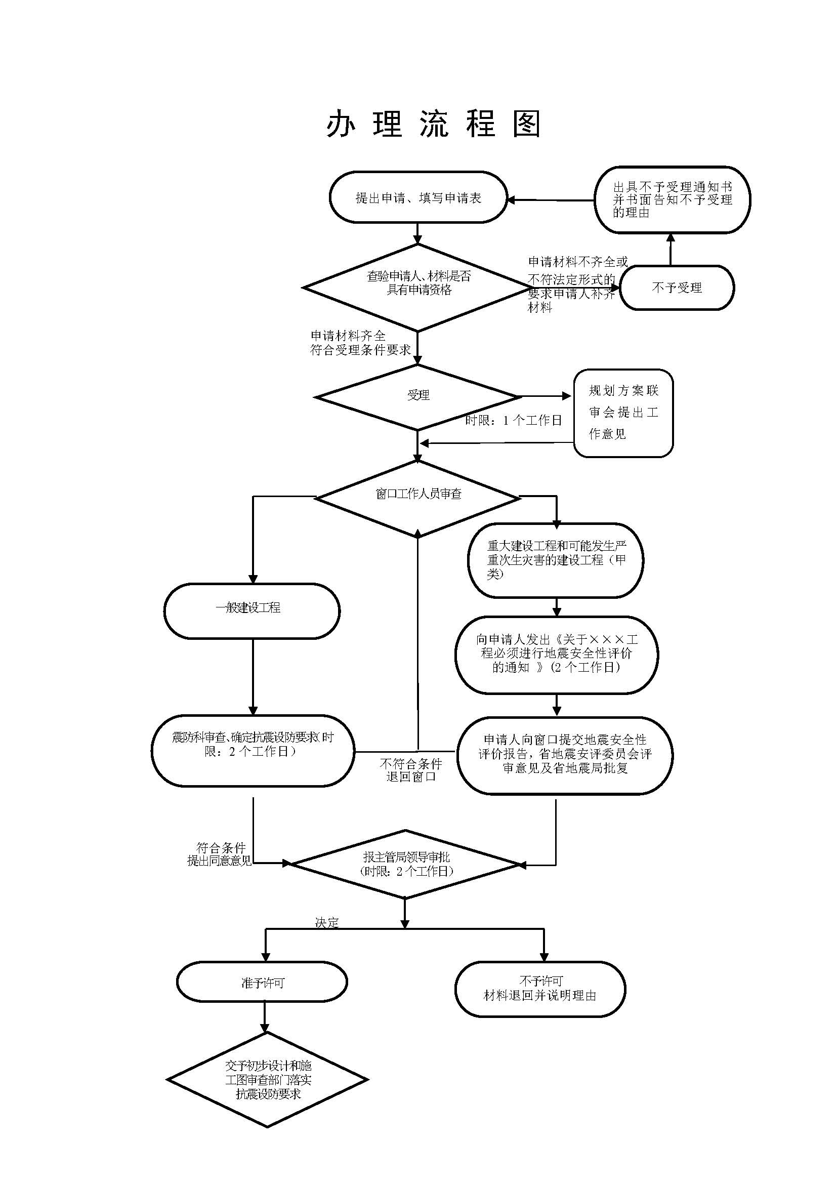 《建设工程抗震设防要求审批行政许可申请表》1份 重大建设工程、可能发生严重次生灾害建设工程(甲类工程)需提交地震安全性评价报告及地震安全性评定委员会评审意见、省地震局的行政批复 一般建设工程需提交工程场地地震地质勘察资料和 建设项目设计总图 |